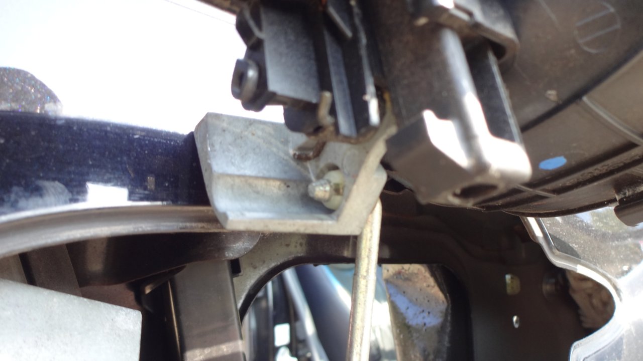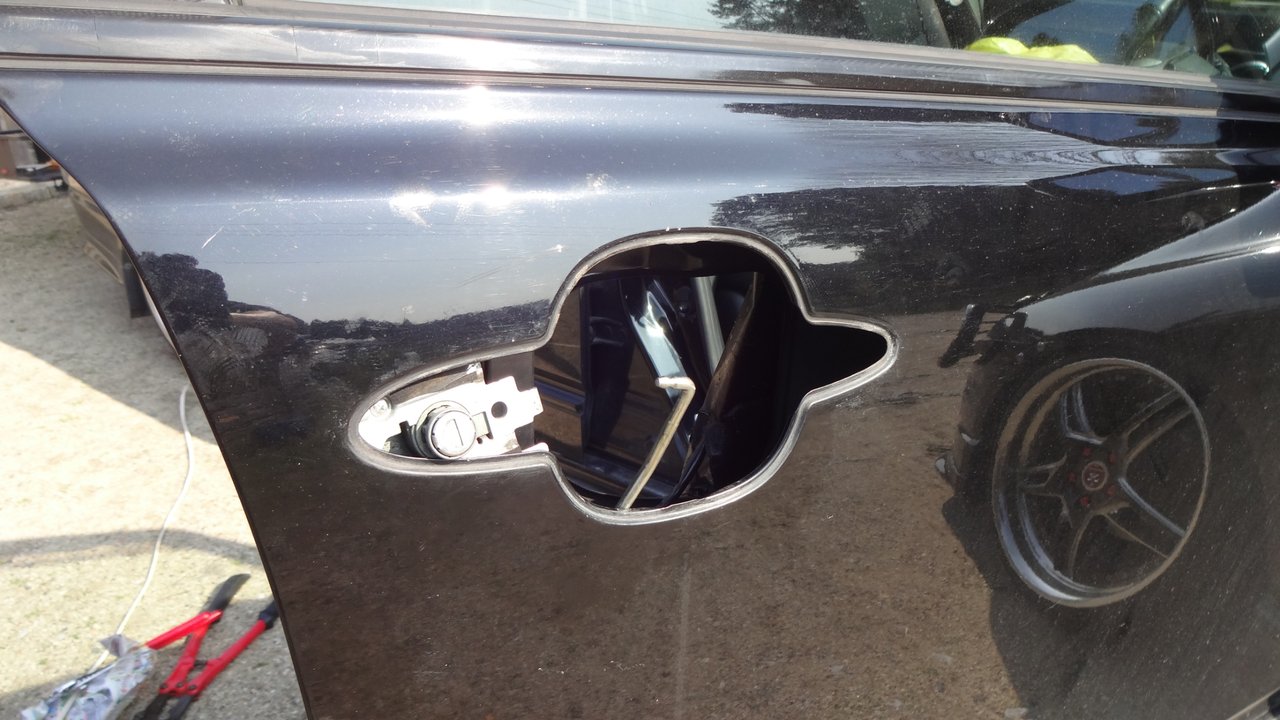 そしてアウターハンドルにドアロックソレノイドから鉄の棒が接続されているのでプラスチックのストッパーをマイナスドライバーなどで広げて鉄の棒を引き抜きます。