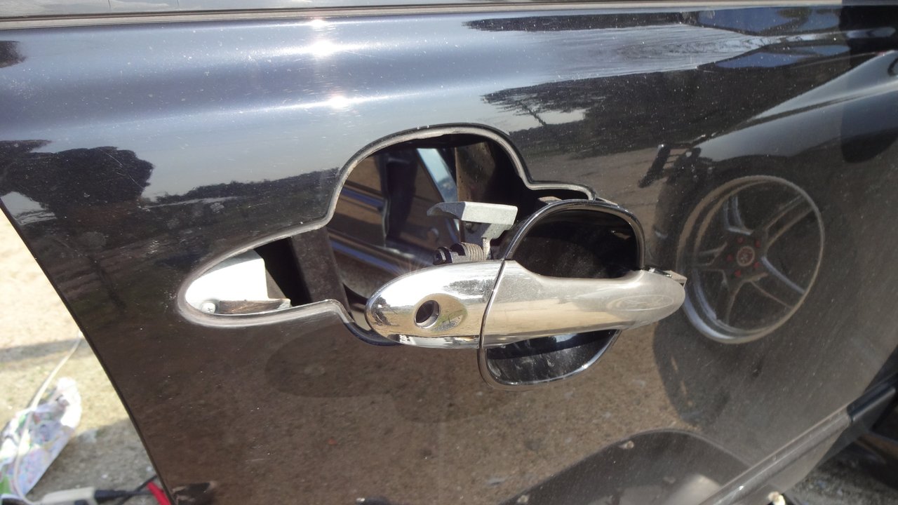 アウターハンドルの固定ボルトとキーシリンダーの固定ボルトを外したらアウターハンドルを後方へスライドさせながら外します。