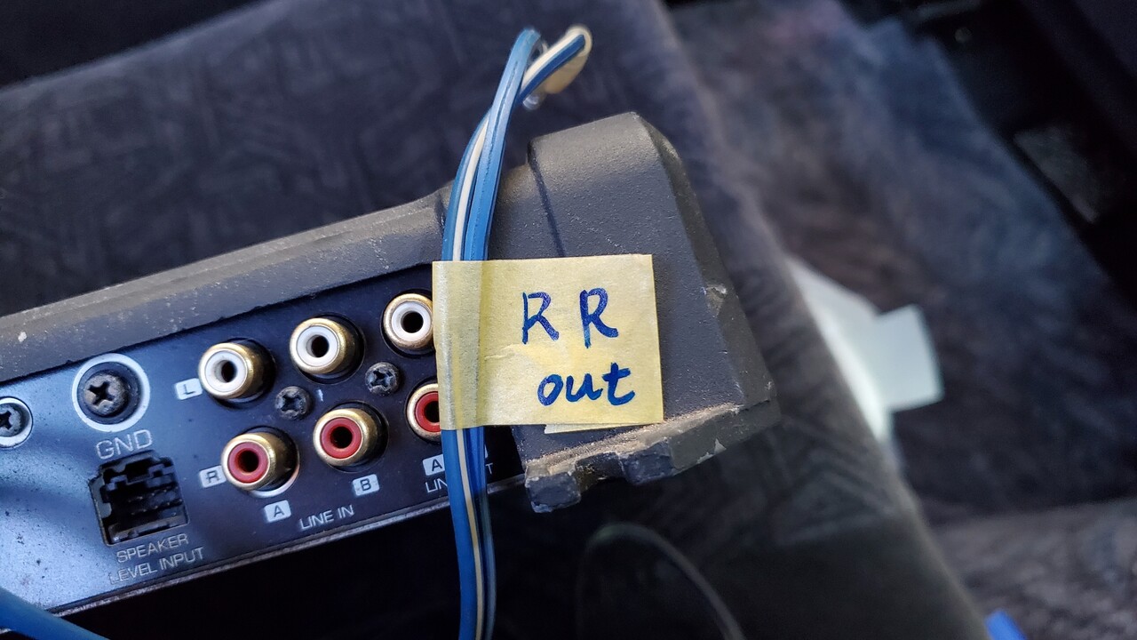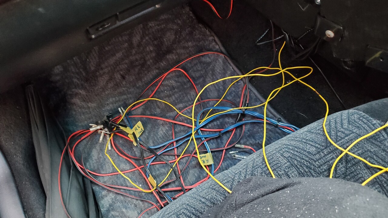 配線の本数が割とエグいことになるのでアンプ側で配線の種類を判別してマスキングテープを配線の車体につなぐ側に巻いて落書きをしておきます。