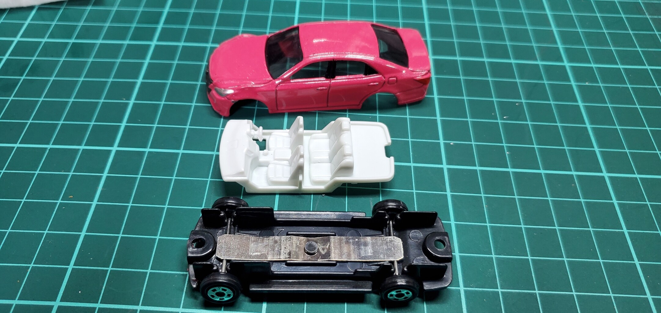 大体のトミカはこういった感じで、ボディ、内装、シャーシの三つに分解されます。