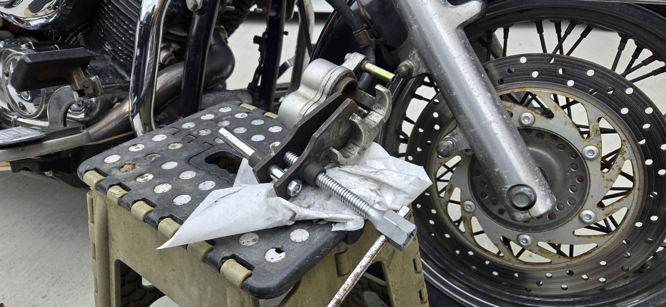 昔は古いブレーキパッドを当てて油圧ジャッキの棒を使ってテコの原理で無理矢理戻していたりしたんですが、作業効率が段違いだしなによりパーツにも体にも安全に使用できます(笑)