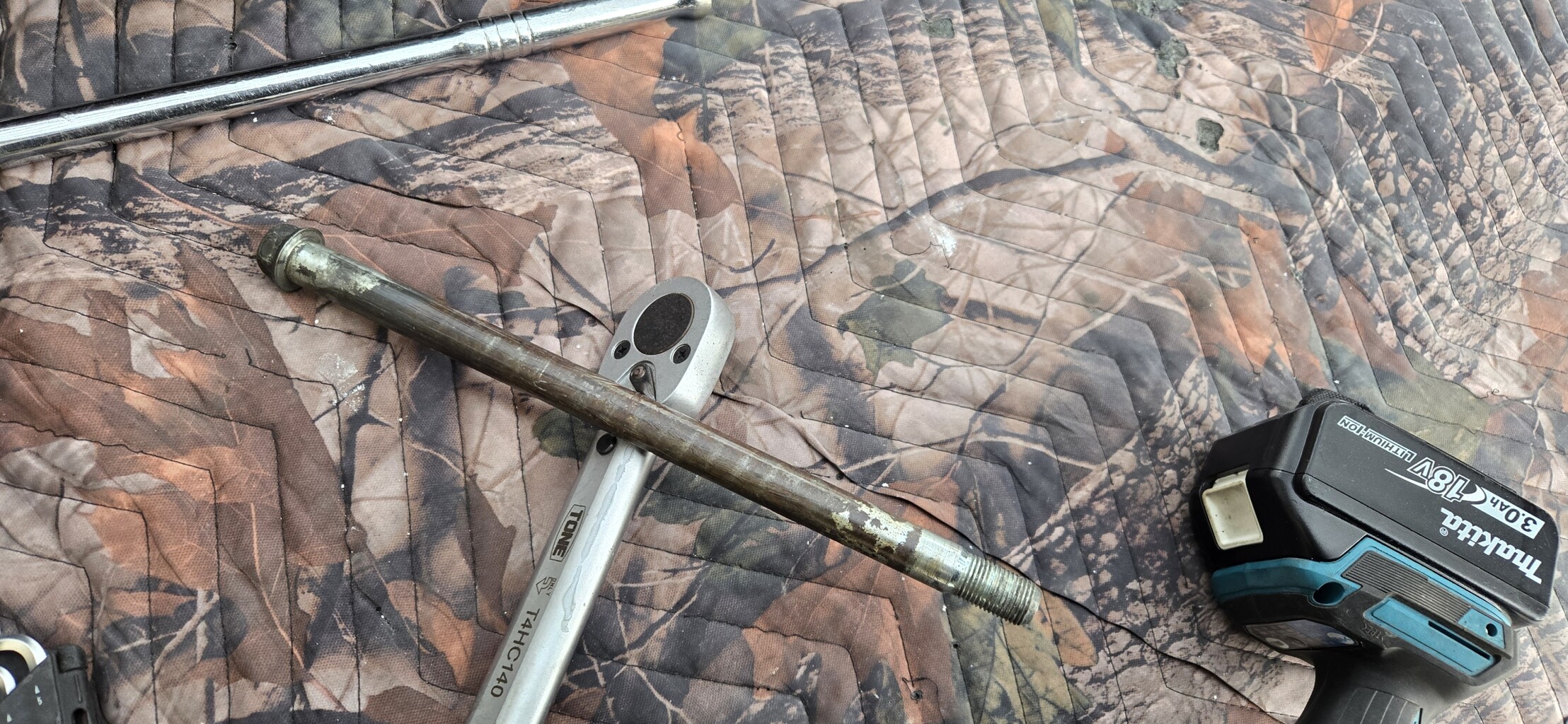 そしてまだ地面にいるうちにアクスルシャフトを19mmのソケットとスピンナーハンドルを使って緩めておきます。