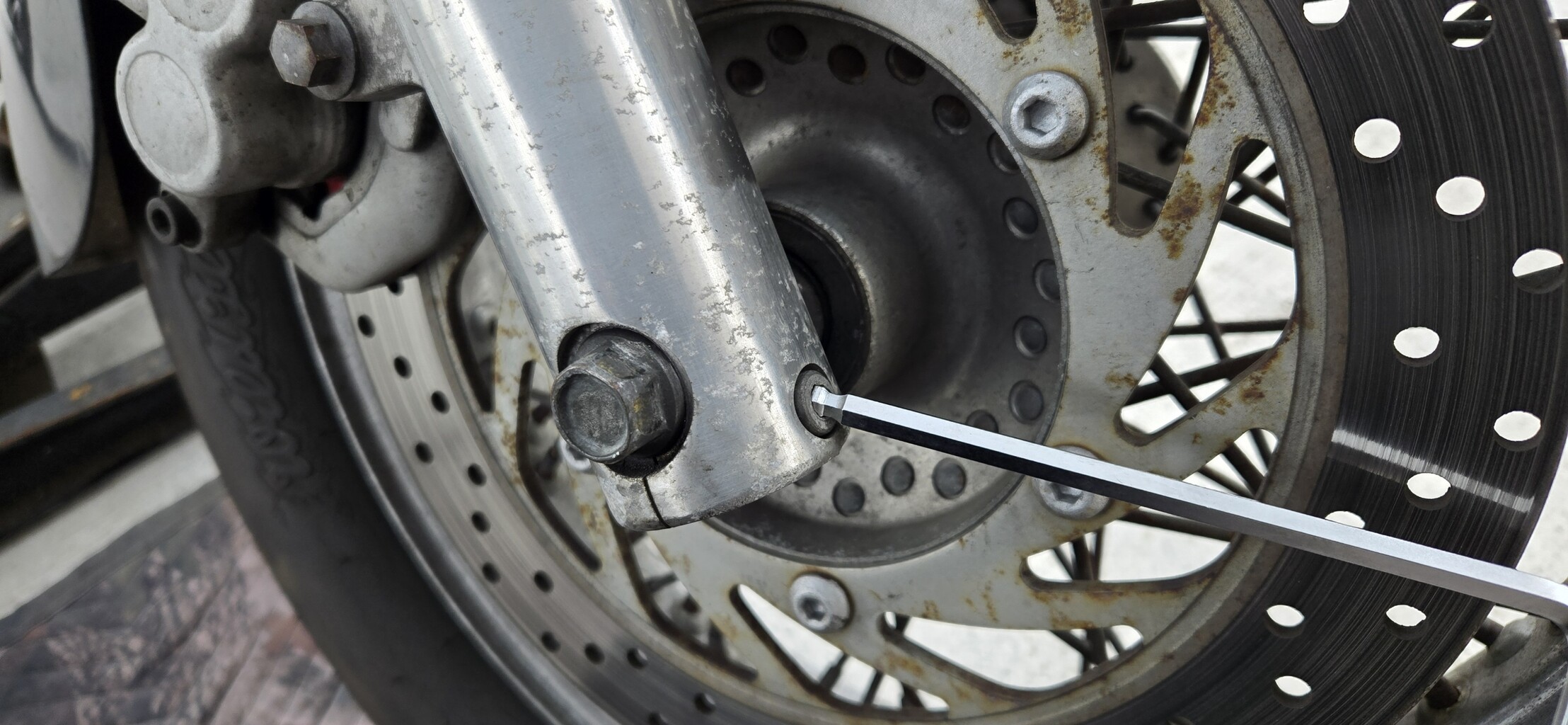 アクスルシャフトは回転による緩みを防ぐためにフロントフォーク下部にキャップボルトが使用されているので六角レンチを使用して緩めます。