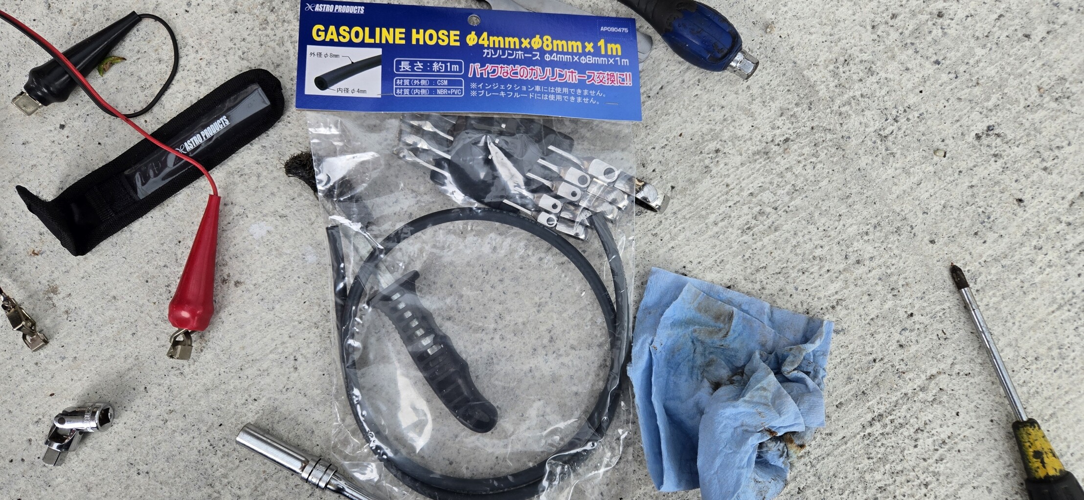 燃料用の色付きホースもホームセンターに売っているのですが、ロードパルはカスタム感を出すのではなく、なるべく純正の素朴な感じを壊したくないので普通のフューエルホースにしました(笑)
