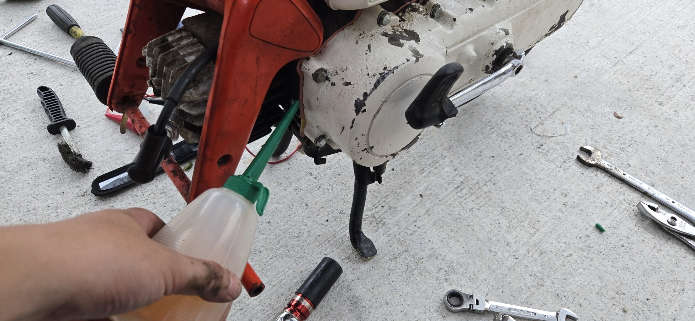 入れるオイルに関してですが、情報を探してみてもどういったオイルを入れるかわからなかったので、家に余っていた軽自動車用のオイルをぶち込むことにしました!